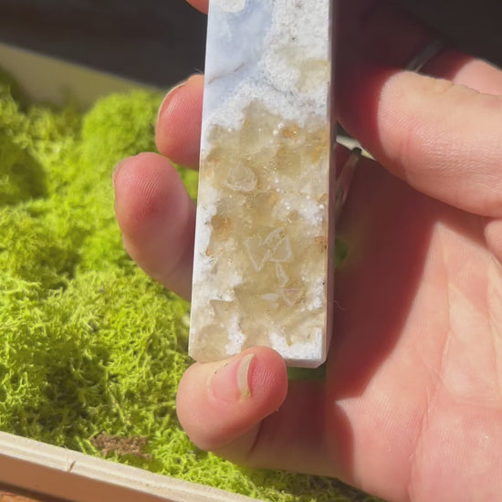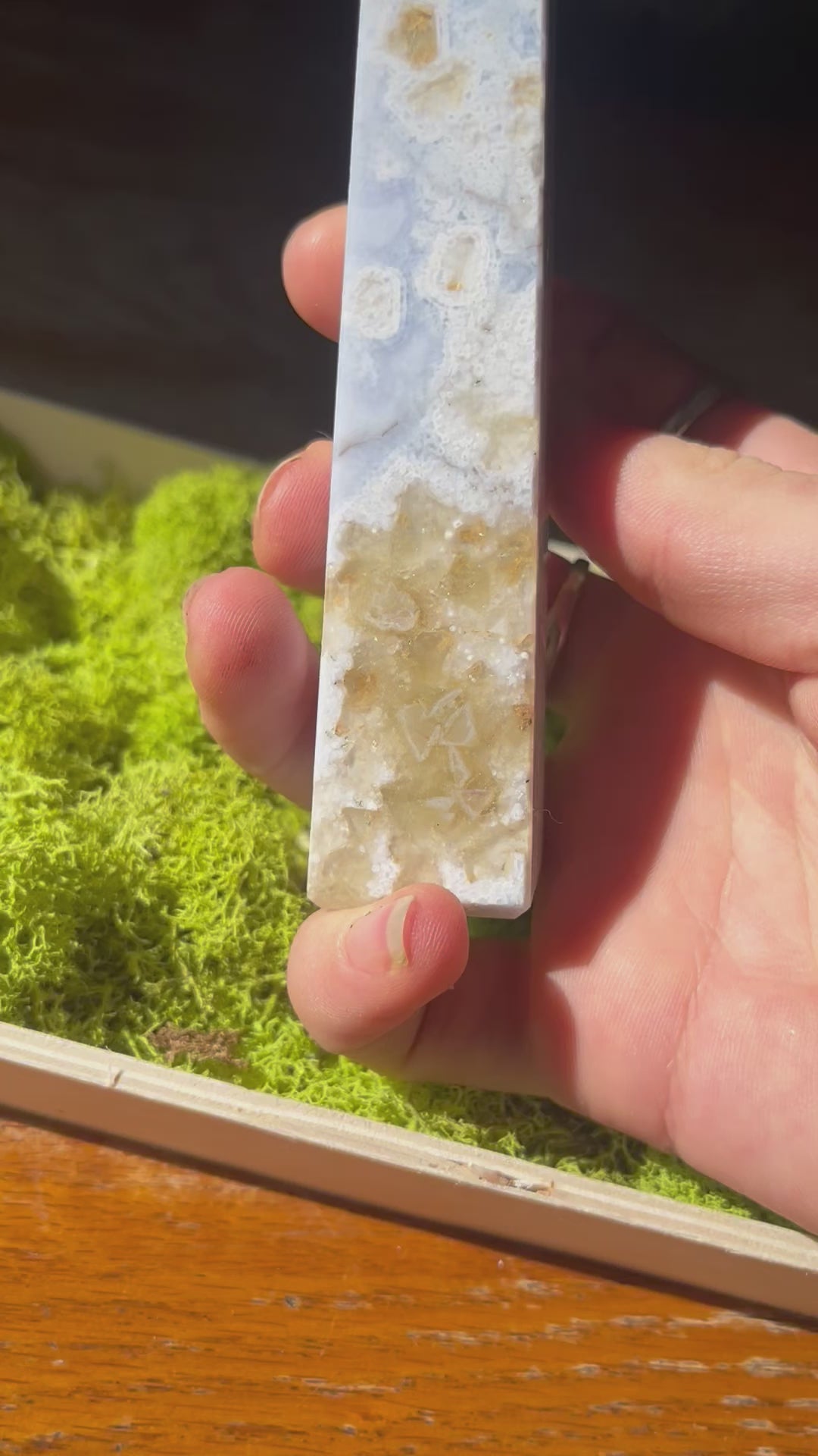 Relax and heal with our Blue Lace Agate Tower. The gentle energy of this stone will infuse calmness and tranquility into your space. Embrace the soothing blue hues and experience the powerful healing properties of blue lace agate. Perfect for meditation and creating a peaceful atmosphere. Weighs 126 grams!