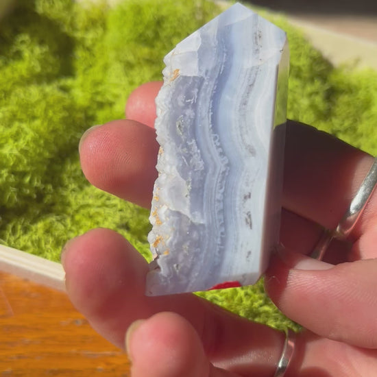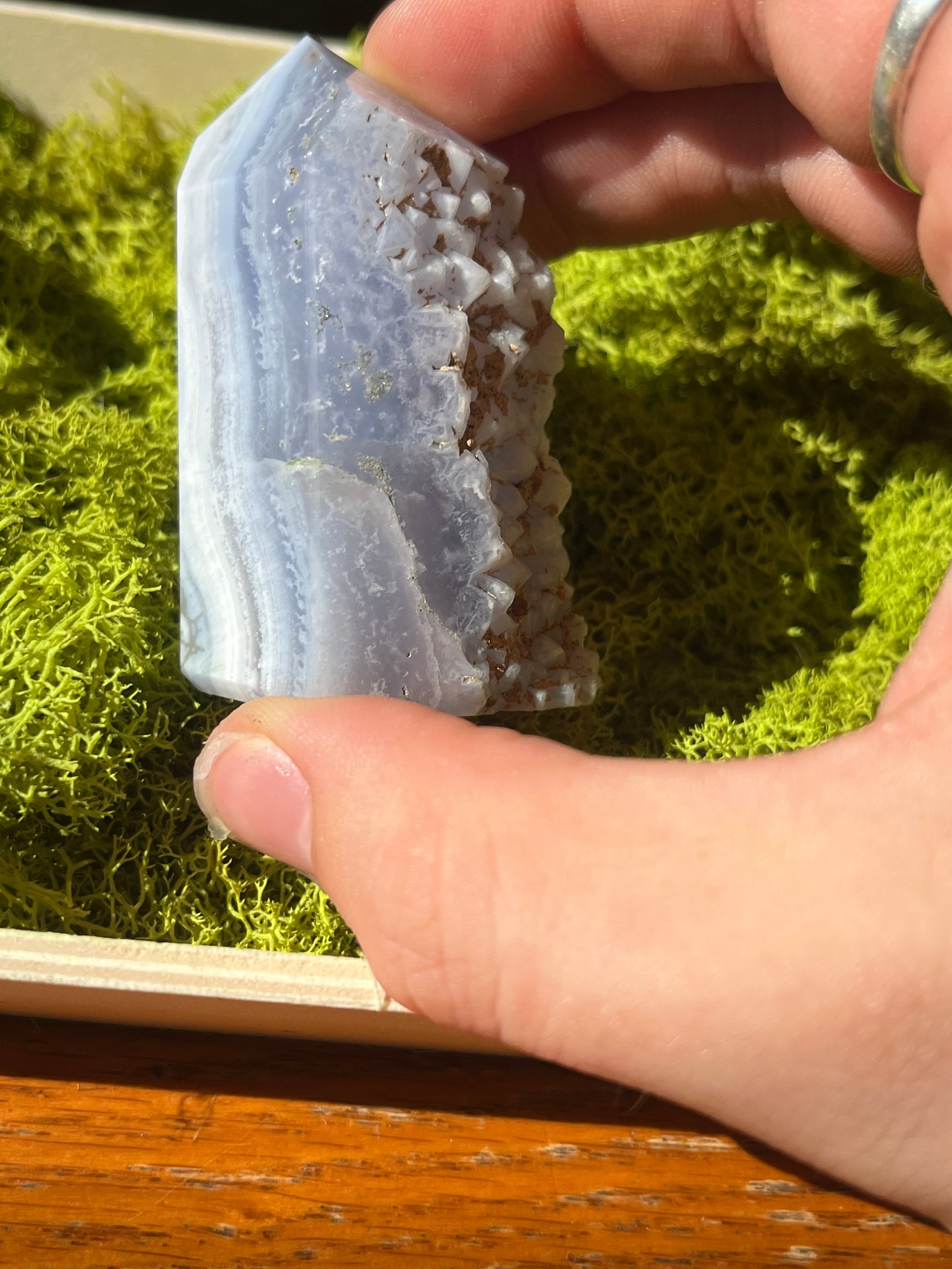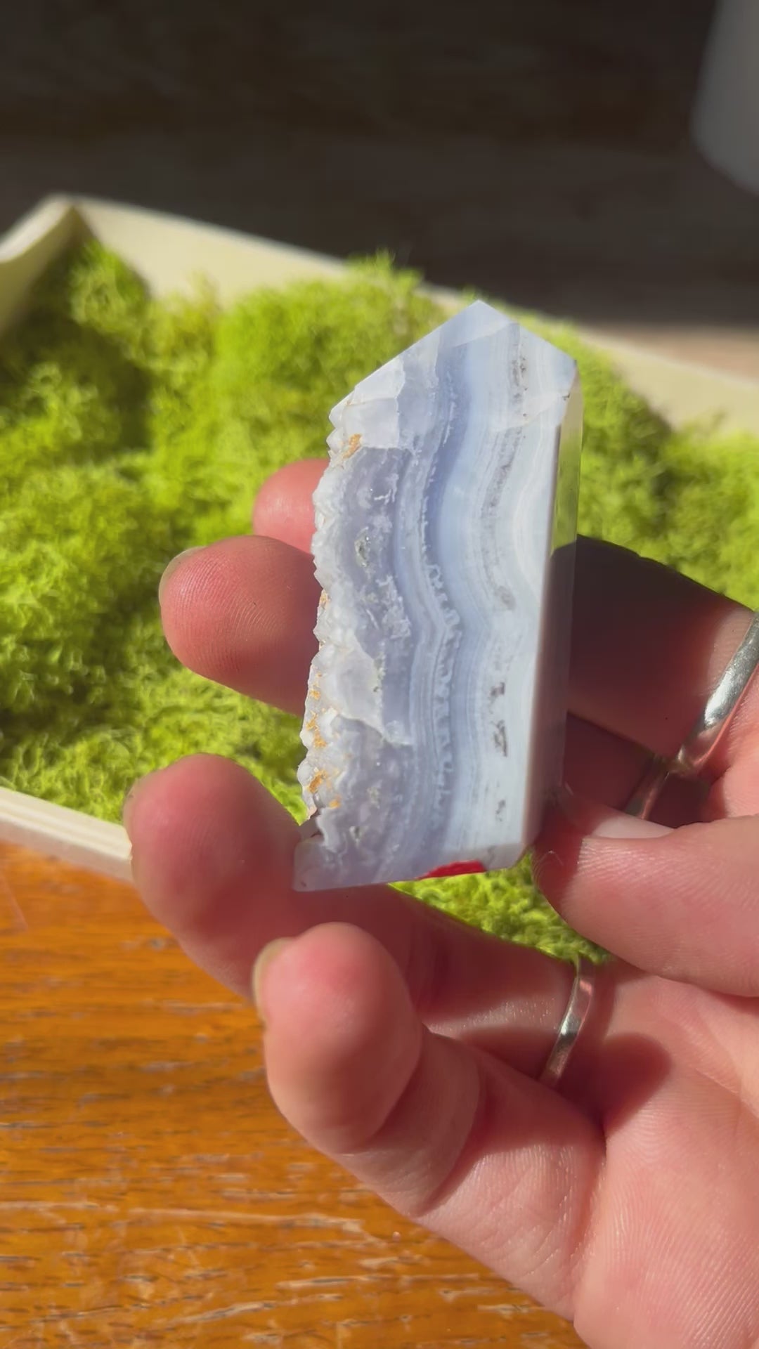 Experience the soothing energy of our Blue Lace Agate Tower, adorned with stunning swirls of blue. This unique crystal boasts healing properties that promote inner peace and tranquility. Perfect for those seeking a little extra zen in their daily lives.