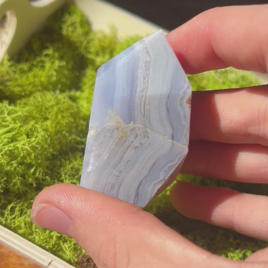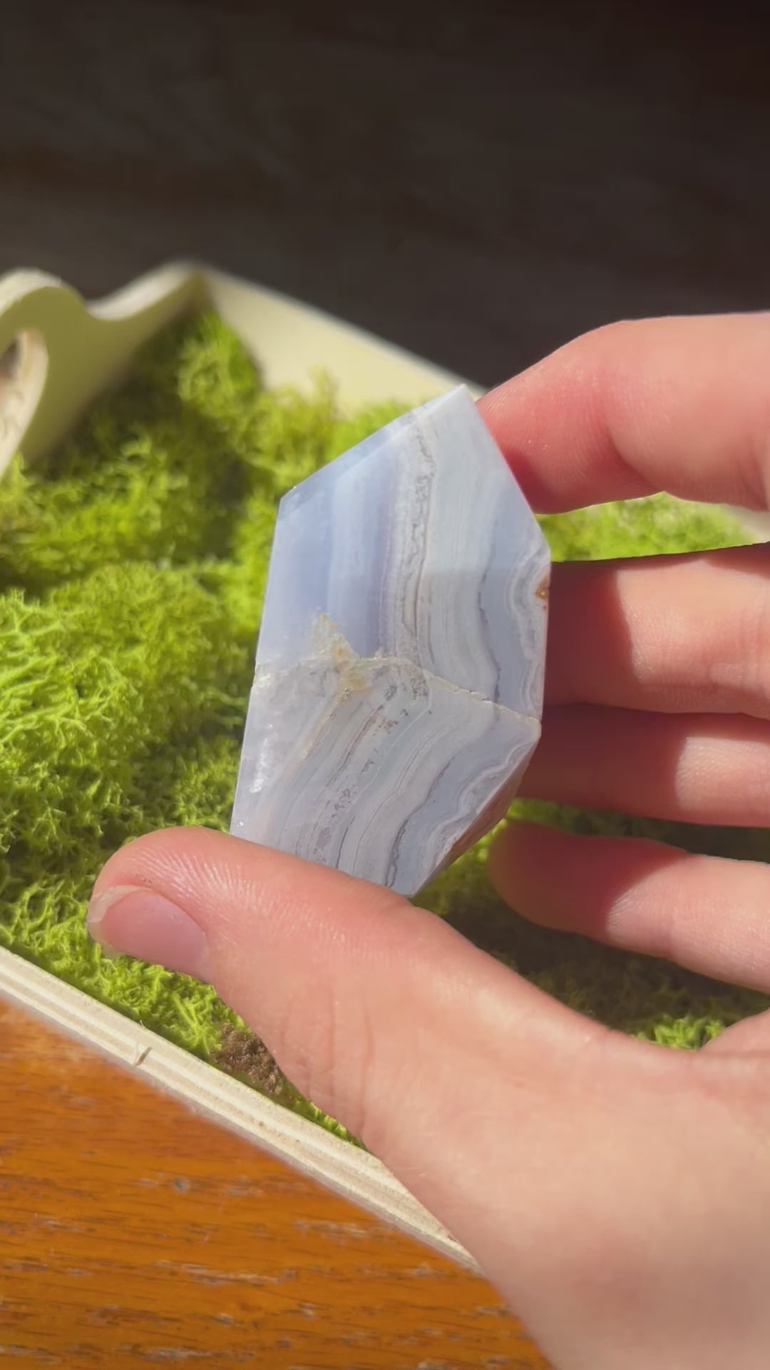 Experience the soothing energy of our Blue Lace Agate Tower. This beautiful crystal boasts calming and healing properties, making it perfect for meditation or keeping in your home for a peaceful atmosphere. Let it bring balance and tranquility to your life. (Warning: may induce feelings of inner peace!)weighs 54 grams!