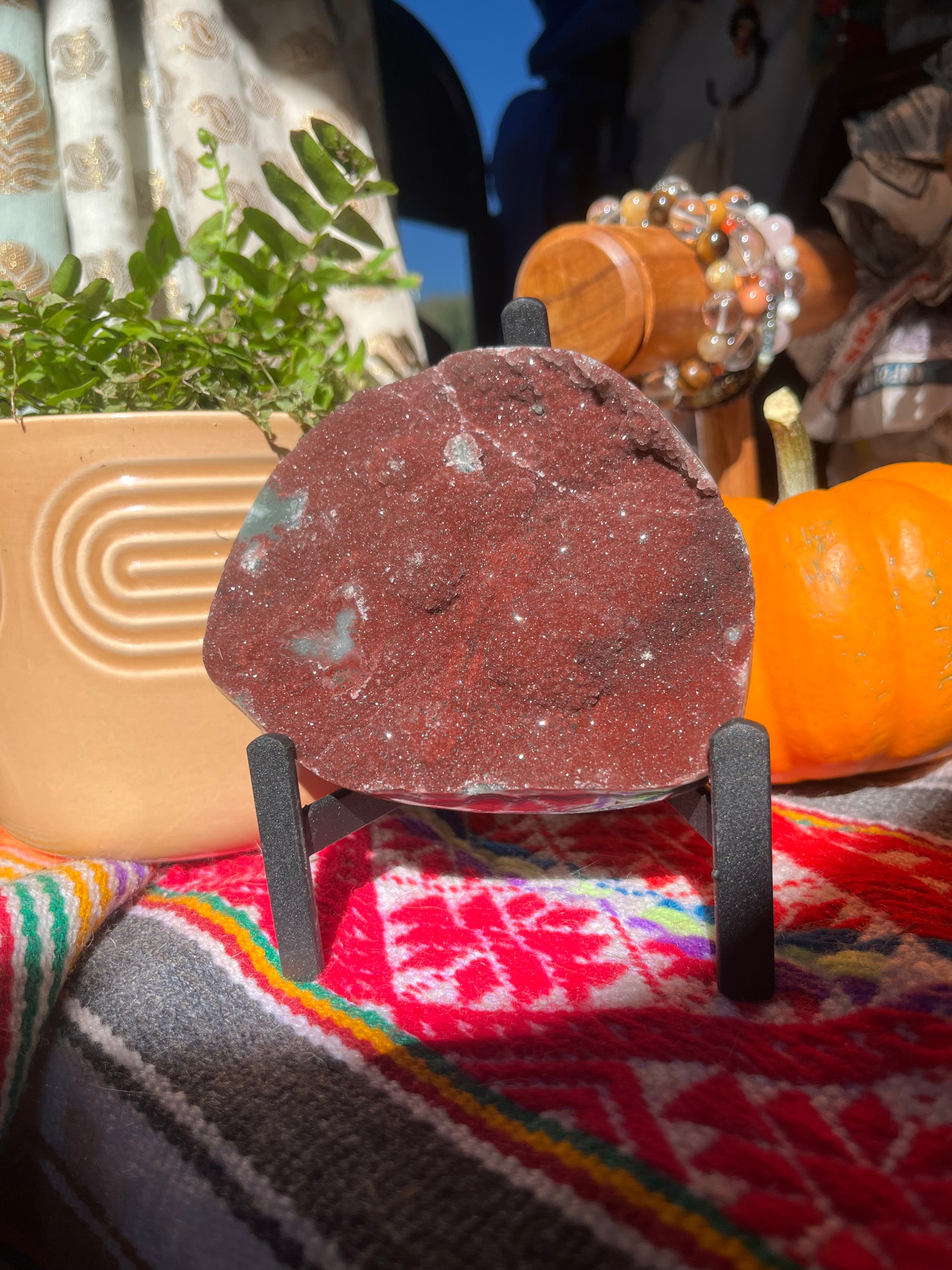 Unleash your inner sparkle with our Sparkly Red Amethyst from Brazil! This rare gem boasts healing properties that will leave you feeling rejuvenated and revitalized. Perfect for those seeking a little extra magic in their life. Get ready to shine bright like a diamond! Weighs 600 grams. Stand Included.